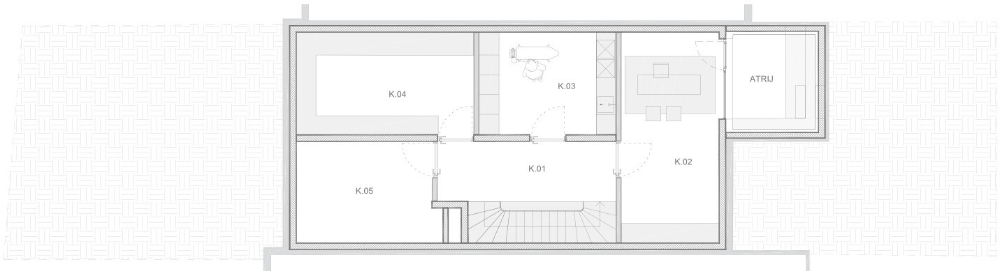 Klet: velik večnamenski prostor, shramba, utility in strojnica. Zaradi atrijske zasnove je del kleti osvetljen z naravno svetlobo. Skupna površina kleti znaša približno 77 m².