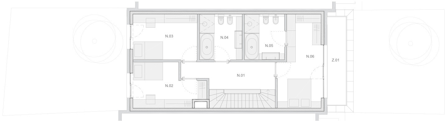 1. nadstropje: glavno spalnico z lastno kopalnico, dve do tri otroške sobe ter dodatna kopalnica.