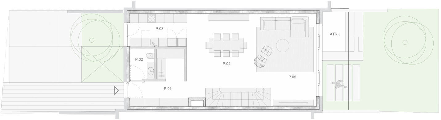 Pritličje: prostoren, odprt bivalni del s kuhinjo, jedilnico in dnevno sobo, ki se nadaljuje na zelenico in skoraj 30 m² veliko teraso – idealen prostor za sproščanje in druženje na prostem. V pritličju sta še hodnik in priročen dnevni WC.