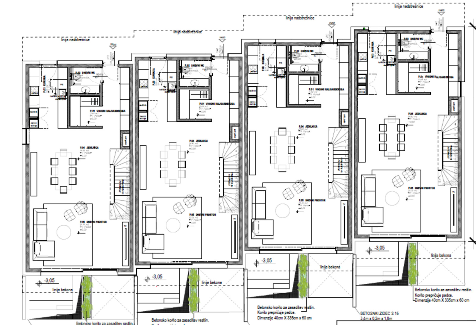 Pritličje: prostoren, odprt bivalni del s kuhinjo, jedilnico in dnevno sobo, ki se nadaljuje na zelenico in skoraj 30 m² veliko teraso – idealen prostor za sproščanje in druženje na prostem. V pritličju sta še hodnik in priročen dnevni WC.