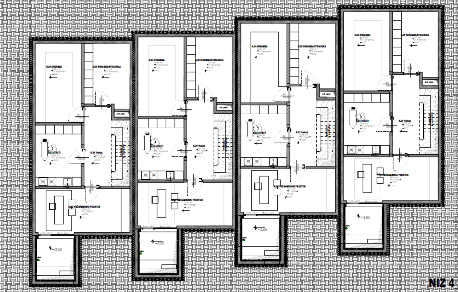 Klet: velik večnamenski prostor, shramba, utility in strojnica. Zaradi atrijske zasnove je del kleti osvetljen z naravno svetlobo. Skupna površina kleti znaša približno 77 m².