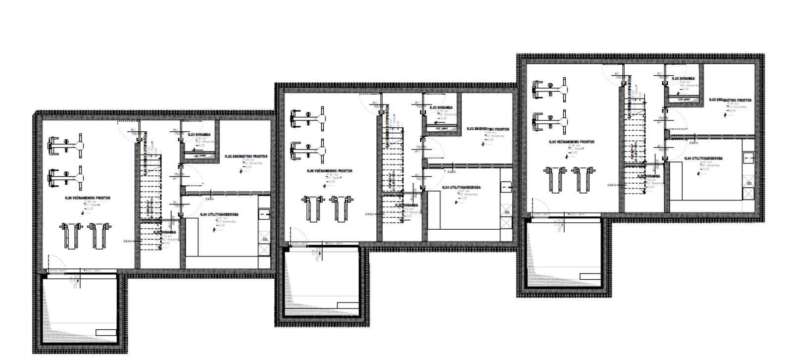 Klet: velik večnamenski prostor, shramba, utility in strojnica. Zaradi atrijske zasnove je del kleti osvetljen z naravno svetlobo. Skupna površina kleti znaša približno 70 m².