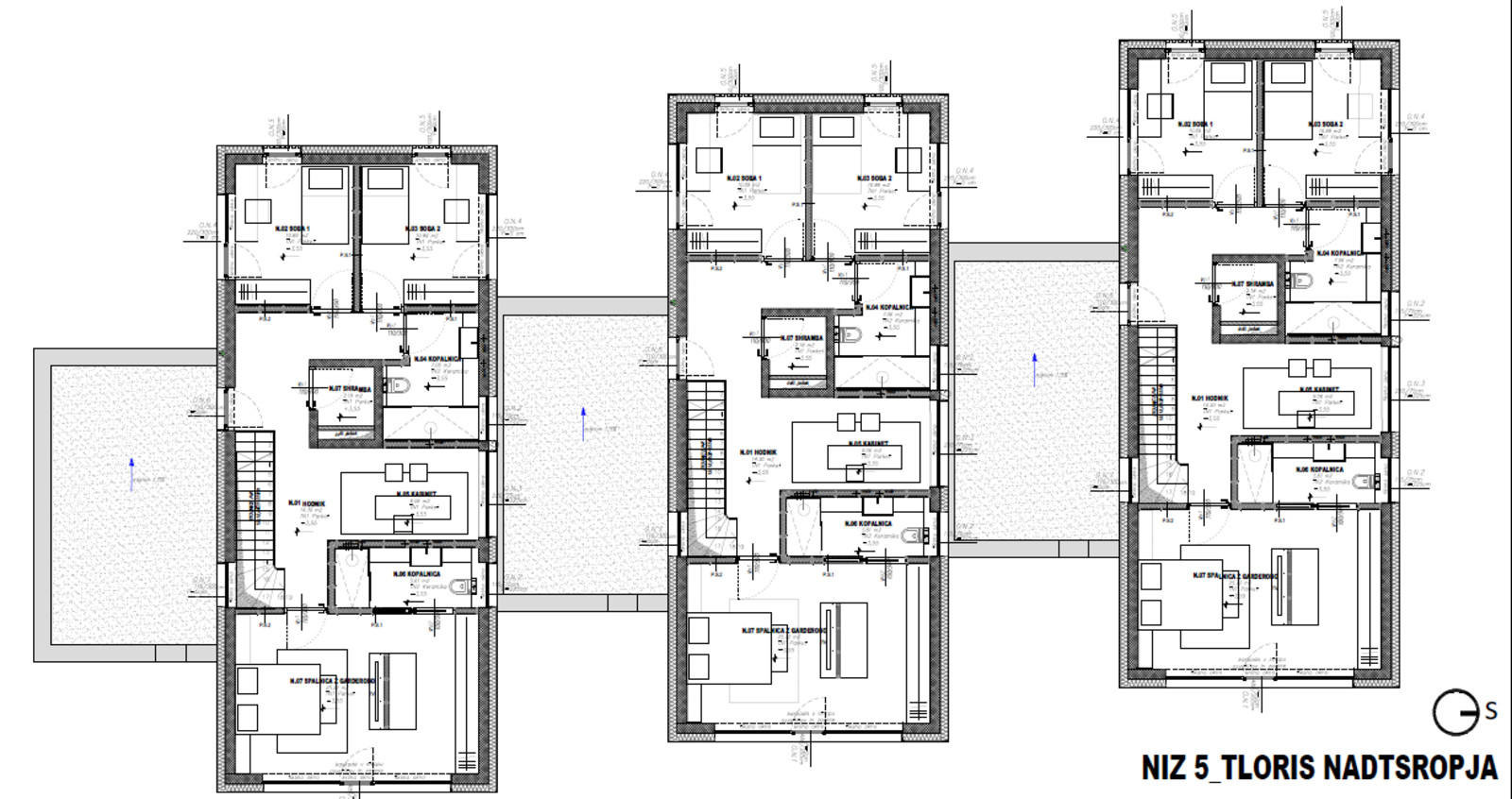 1. nadstropje: glavno spalnico z lastno kopalnico, teraso, dve do tri otroške sobe ter dodatna kopalnica in shramba.