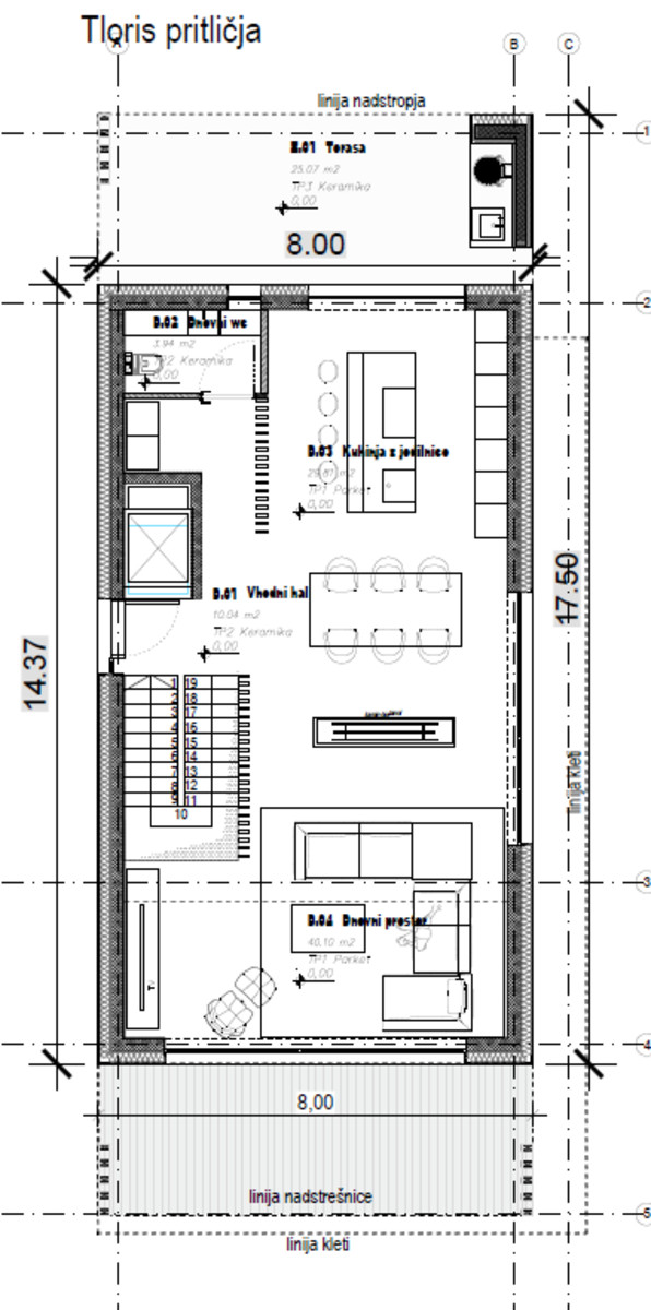 Pritličje: prostoren, odprt bivalni del s kuhinjo, jedilnico in dnevno sobo, ki se nadaljuje na zelenico in veliko teraso – idealen prostor za sproščanje in druženje na prostem. V pritličju so še hodnik, priročen dnevni WC, garderobna soba in garaža.