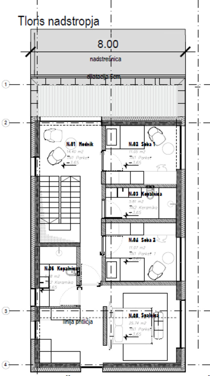 1. nadstropje: predvideni so spalni prostori, kopalnice, gardederoba, utility ter shramba.
